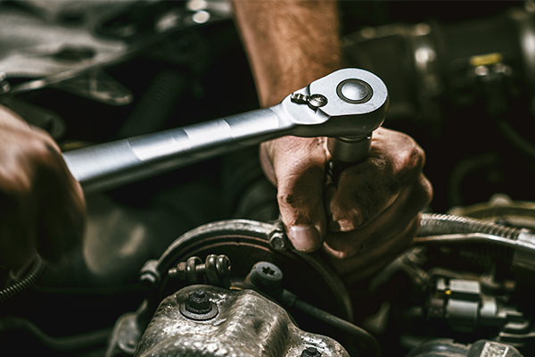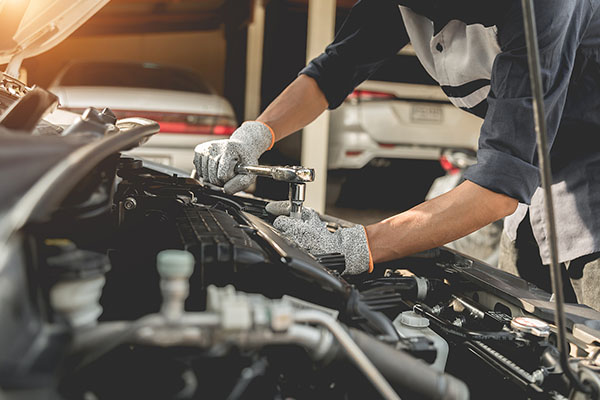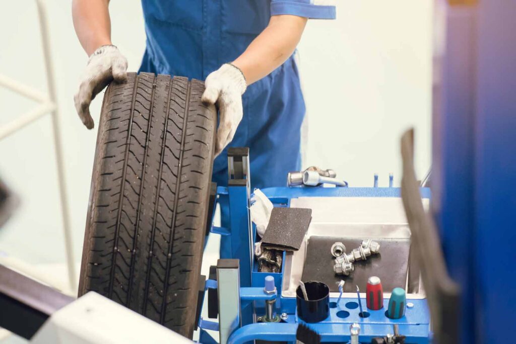 Wheel balancing or repair and change car tire at auto service garage or workshop by mechanic, toned